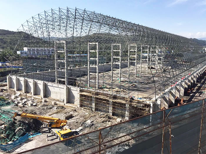 1.3 工程概况:该石狮网架类型为四角锥柱面网壳, 宽度79m,长度150m,高度36米。